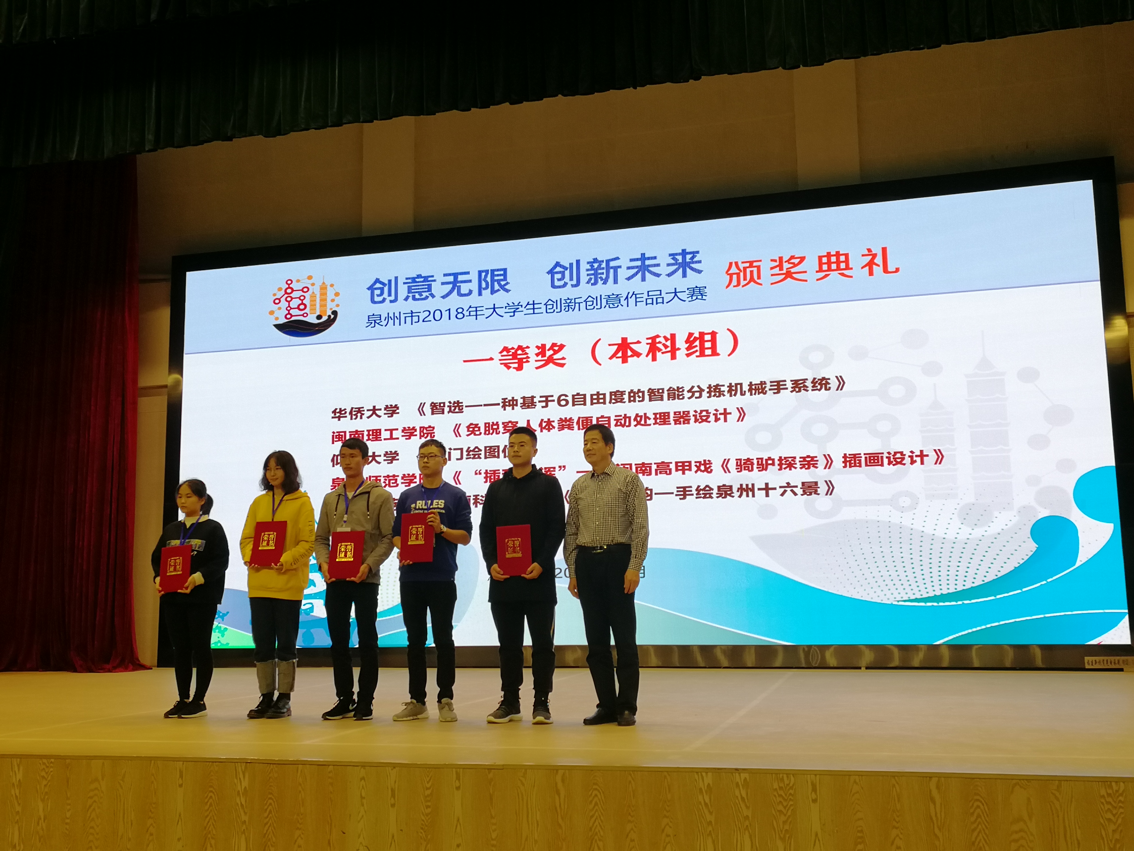 11月23日,泉州市2018年大学生创新创意作品大赛决赛在黎明职业大学举行。beat365报送的作品《龙门绘图仪》荣获A组技术革新类一等奖,《奇幻之旅》荣获A组创意设计类二等奖。