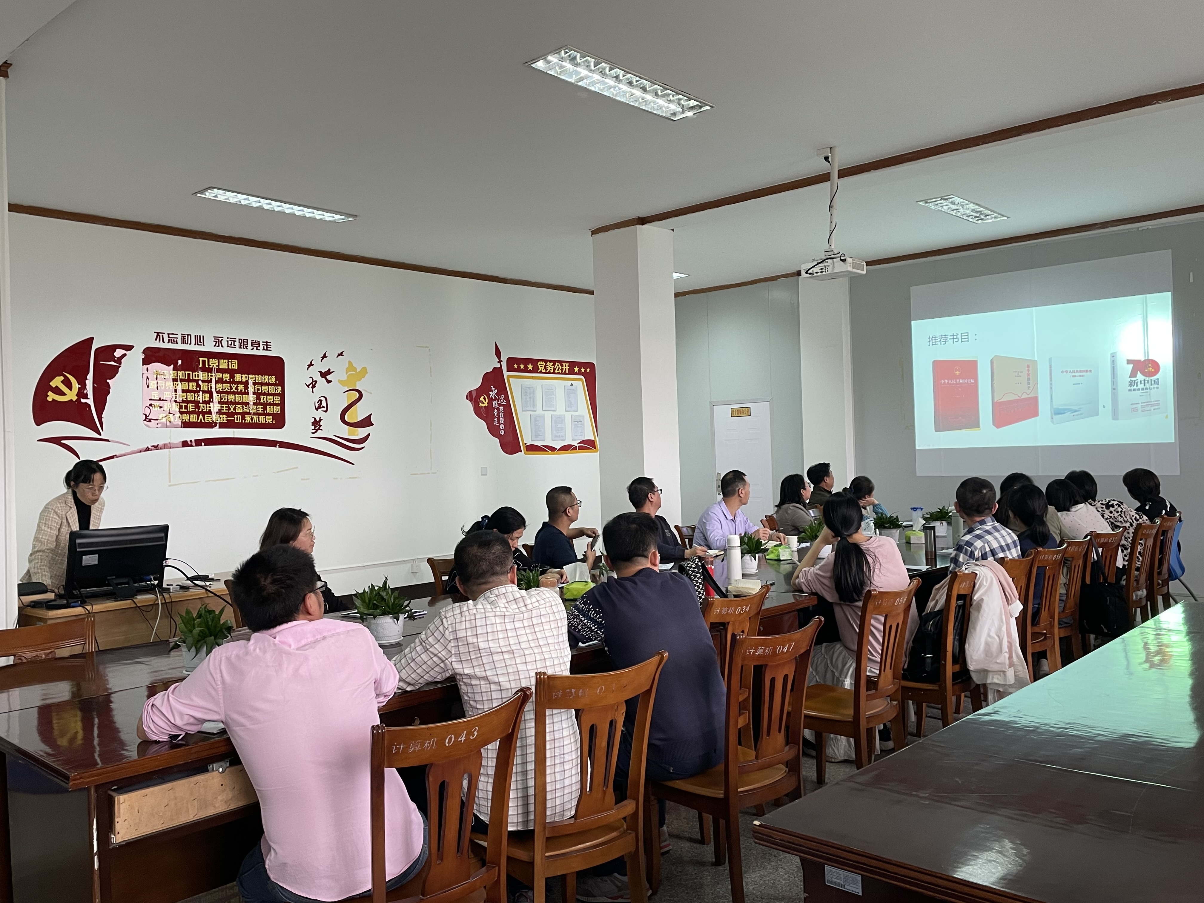 活动中教工支部各支委就近期深入学习四史的经典书目一一进行介绍,并分享了自己学习四史过程中的经验体会。郑燕娥向与会同志们推荐了《论中国共产党历史》、《中国共产党简史》、《新中国砥砺奋进的七十年》等介绍党史、新中国史的经典书籍,同时分享了读书时对新中国的发展历程的体会。王琴推荐了《改革开放论》、《对外开放起始录》、《大国改革进行时》等书籍,提出“改革开放为了什么”“改革开放的实质是什么”等问题,并分享了个人的见解。张苏嘉分享了自己通过研读《社会主义发展史纲》一书,深入地了解了社会主义发展的六个阶段。