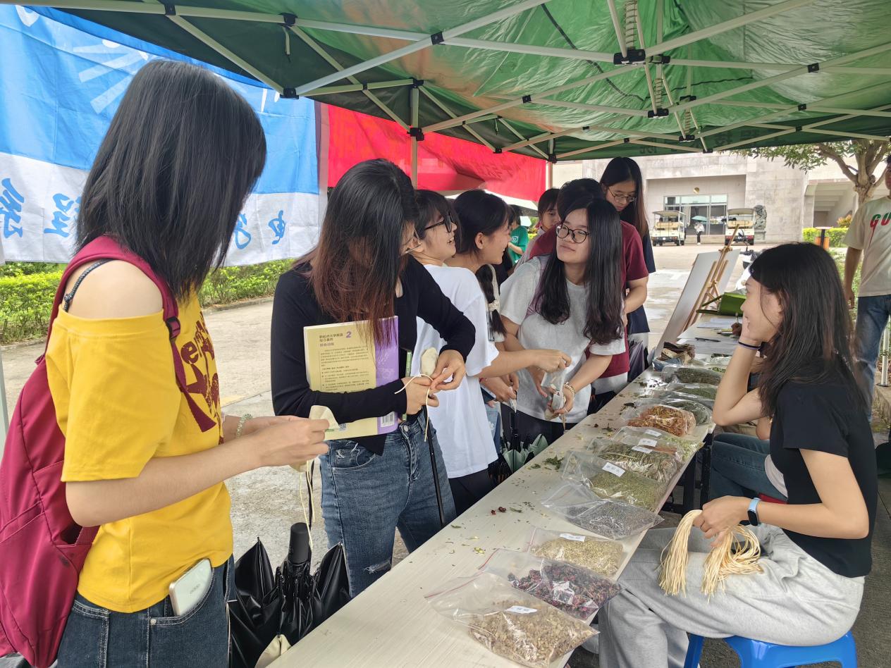 在香囊制作区摆满了各色棉布、丝线、香料(艾草、藿香、茉莉花等)等制作材料。同学们围聚桌前,精心挑选心仪的香料和材料,有条不紊地进行香囊制作。学生党员特别介绍了艾草、藿香等香料除驱虫避疫外,在传统文化中象征 “驱邪扶正” 的寓意,引导同学们将 “清廉”“正气”融入香囊设计。一个个精美的香囊逐渐成型,散发着浓郁的香气,也为大家在炎炎夏日带去清廉之风。