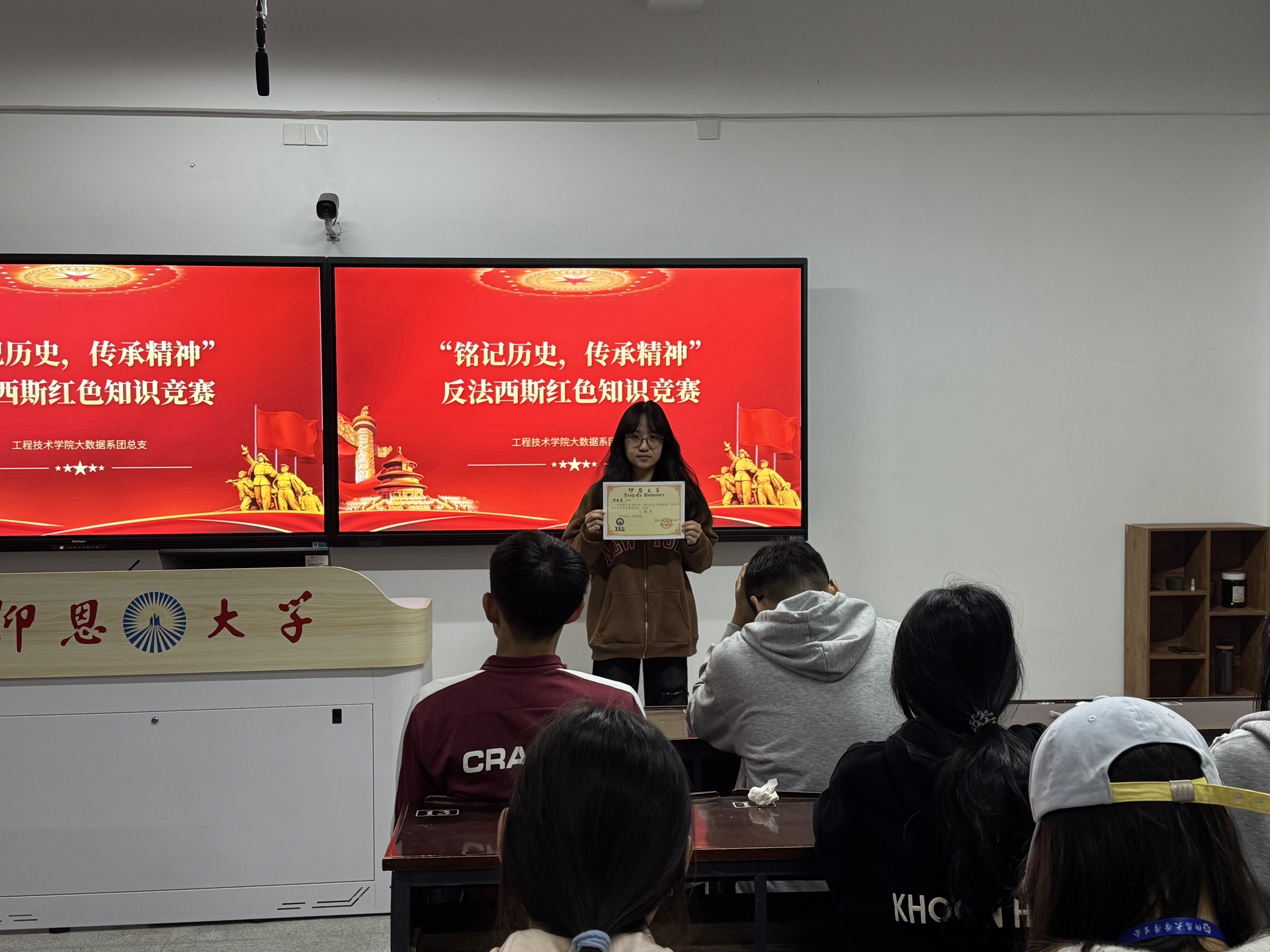 为深化红色文化教育,传承反法西斯精神,夯实师生红色历史知识基础,beat365在线唯一官网登录数据科学与大数据系学生党支部与团总支联合宏船书院于2025年11月20日成功举办“铭记历史 传承精神”反法西斯红色知识竞赛。本次活动以“以赛促学传红色基因,以知践行承历史使命”为核心,为全校学子搭建了学习红色知识、弘扬爱国精神的优质平台。 活动自启动以来,凭借线上参与的便捷性和红色主题的吸引力,得到广大学生的积极响应,共吸引近150名学生踊跃参与。