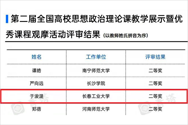 全国高校思想政治理论课教学展示暨优秀课程观摩活动是全国高校思想政治理论课教学比赛中主办规格最高、参赛课程最全、选手水平最强的一项活动。本次评选活动,吉林省共推荐17位教师参赛。于浚以2021年吉林省高校思政课“精彩一课”大赛一等奖的成绩入围全国大赛,并最终在历时近半年的层层选拔中获得二等奖