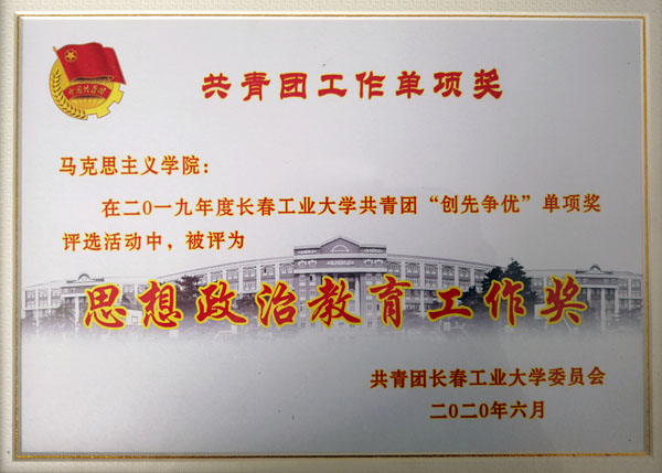 2019年度共青团“创先争优”表彰中,学院团总支荣获“思想政治教育工作奖”,团总支书记李化旭被评为优秀学生团干部,李昊被评为优秀团员。