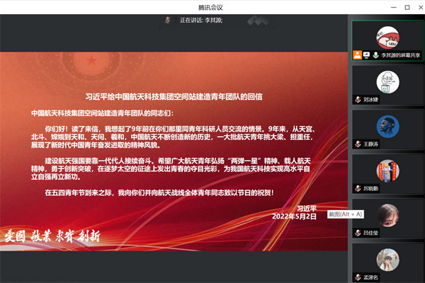 本网讯(通讯员 李其源)五四前夕,习近平总书记给中国航天科技集团空间站建造青年团队回信,向航天战线全体青年致以节日的祝贺。近日,beat365在线唯一官网团总支、各年级团支部通过线上方式开展“学习习近平总书记重要回信精神”主题团日活动。