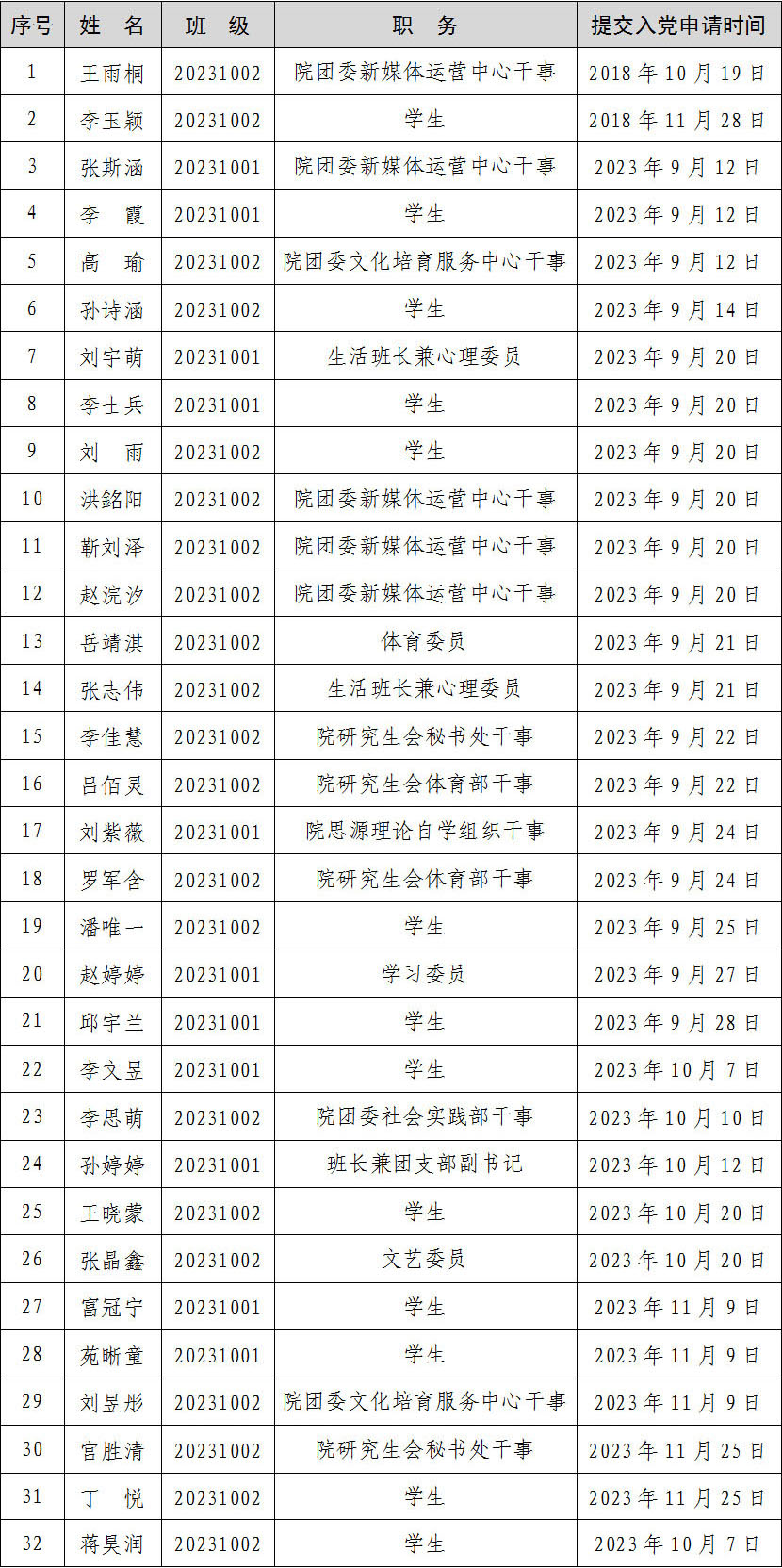 按照发展党员工作有关规定,根据党员推荐和群团组织推优情况,经研究生支部委员会研究,并报学院党委备案,确定王雨桐等32名同学为入党积极分子。