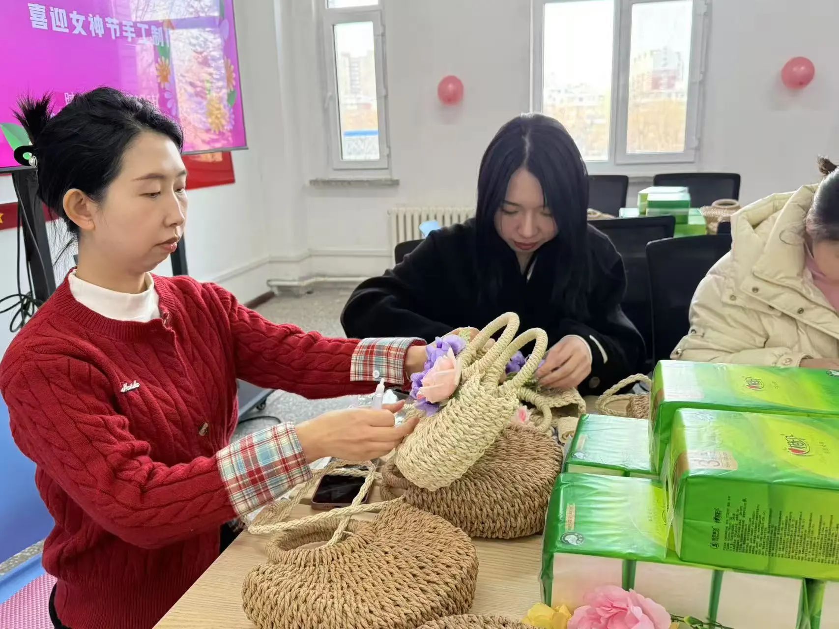 活动伊始,于浚湜院长发表了热情洋溢的妇女节贺词。她向辛勤耕耘在教育一线的女教职工们致以最诚挚的节日祝福,介绍了本次活动的目的与流程,为活动拉开了欢乐的序幕,现场气氛温馨而热烈。制作环节中,教职工们充分展现出对美的独特理解与追求。有人用仿真花制作出娇艳花束,粘贴在包身,仿佛将整个春天都收纳其中;有人用彩色丝带编制俏皮蝴蝶结作为点缀,让草编包增添了几分灵动;还有人用珠子和亮片拼出个性图案,创意满满。现场欢声笑语不断,大家一边动手制作,一边交流心得,氛围轻松融洽。最后,于浚湜院长鼓励大家在今后的生活中,继续保持对美好事物的追求与创造力,以更加饱满的热情投入到工作与生活中。