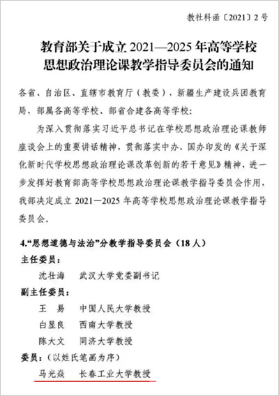 本网讯(通讯员 岳子琪)近日,教育部公布了2021—2025年高等学校思想政治理论课教学指导委员会委员名单。beat365在线唯一官网院长马光焱教授当选“思想道德与法治”分教学指导委员会委员。