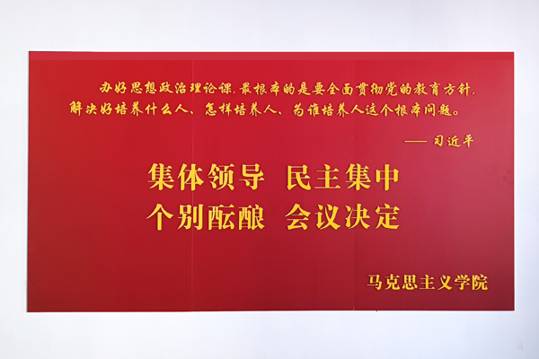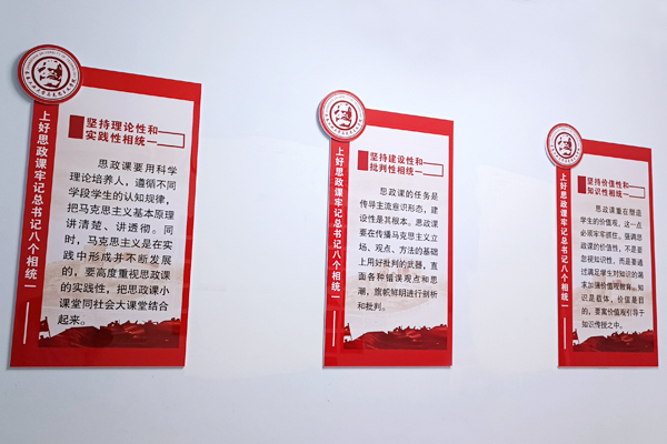 文化墙以学院现有办公教学场所、党员活动室和会议室为主要区域,内容涵盖了习近平总书记对思政课教师的殷殷嘱托和谆谆教诲、学院简介、教师宣誓、风采展示等主题,形式简洁大气,布局庄重大方,充分体现了时代赋予高校beat365在线唯一官网的铸魂育人、立德树人的历史使命和光荣任务,营造了“处处是课堂、时时受教育”的浓厚氛围。