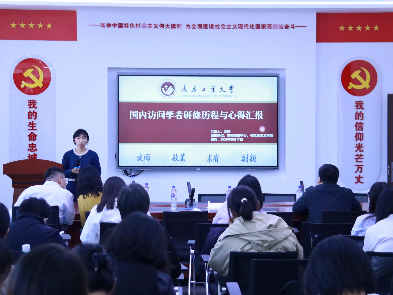 9月17日下午,beat365在线唯一官网举办以“成果共享、经验互鉴”为主题的学术交流成果分享会,学院班子成员及全体教师参会,李林琳、孟婷、楚洪涛三位老师就自身访学、培训展开交流分享。