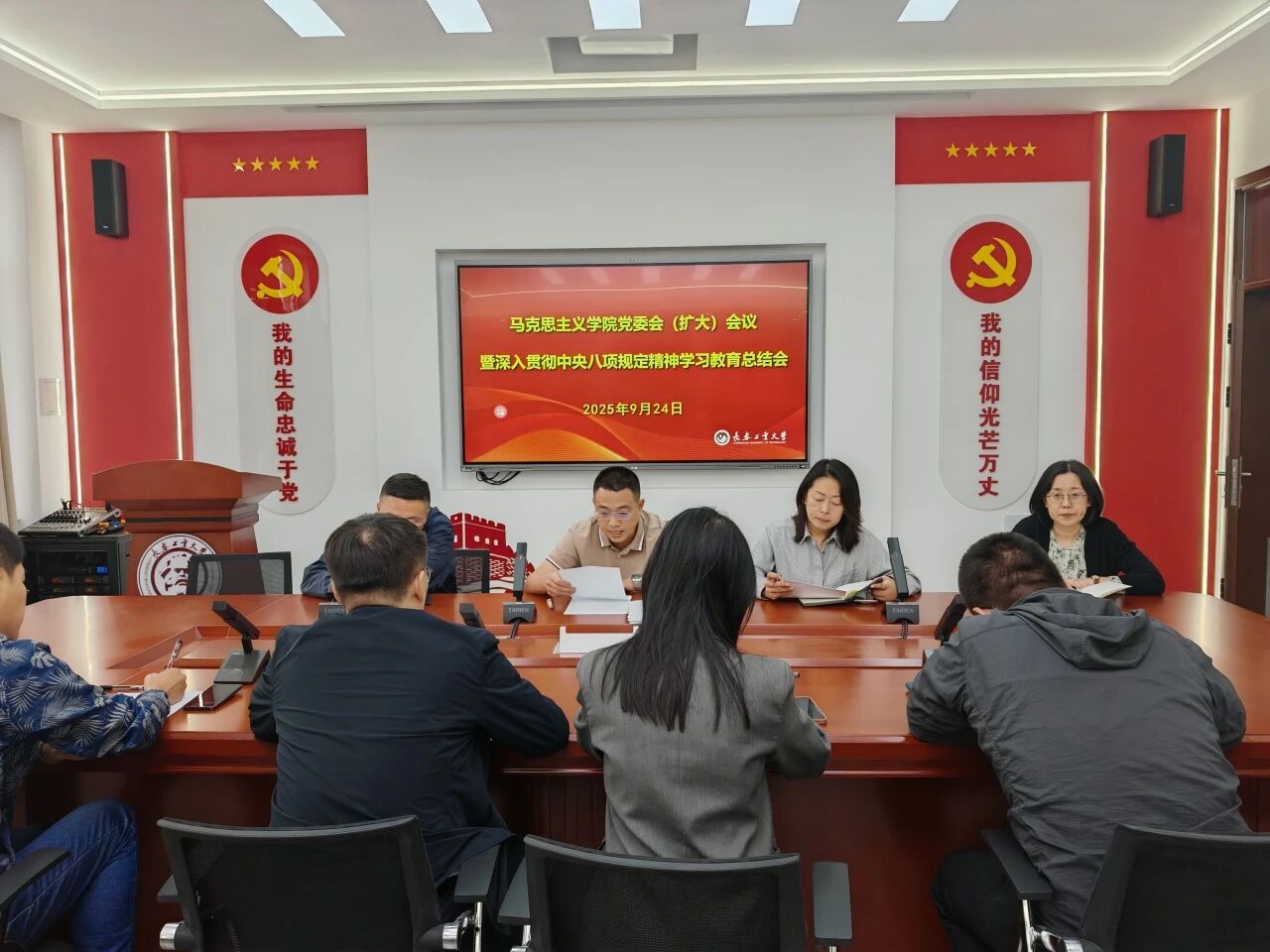 9月24日下午,beat365在线唯一官网召开党委会(扩大)会议暨深入贯彻中央八项规定精神学习教育总结会。党委书记钟旭主持会议,对学院学习教育取得的经验成效进行全面总结并讲话;院长兼党委副书记于浚湜传达了习近平总书记关于深入贯彻中央八项规定精神学习教育的重要指示精神和中央党的建设工作领导小组会议精神;副院长王晓光传达了省委、学校党的建设工作领导小组会议精神;副院长高博传达了《中共beat365在线唯一官网委员会关于建立健全作风建设长效机制的工作方案》。