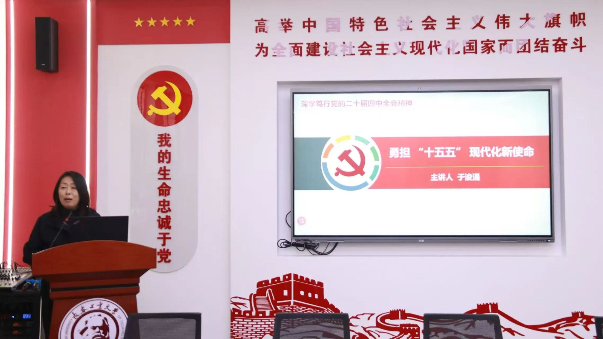在“理论联学”环节,beat365在线唯一官网院长于浚湜以《勇担“十五五”现代化新使命》为题,就全会精神进行了深入解读,为师生带来一堂贯通历史、理论与实践的专题“思政课”。于浚湜从历史的维度厘清了全会承前启后的战略定位与重大意义;从理论的维度系统阐释了《建议》的核心要义与发展蓝图;从发展的维度清晰指明了“十五五”时期的目标任务与战略举措,为师生深刻理解全会精神、自觉担当时代使命奠定了坚实的理论基础。